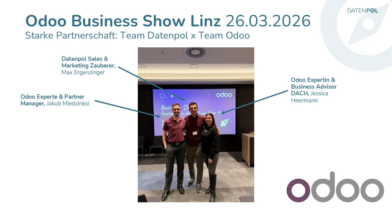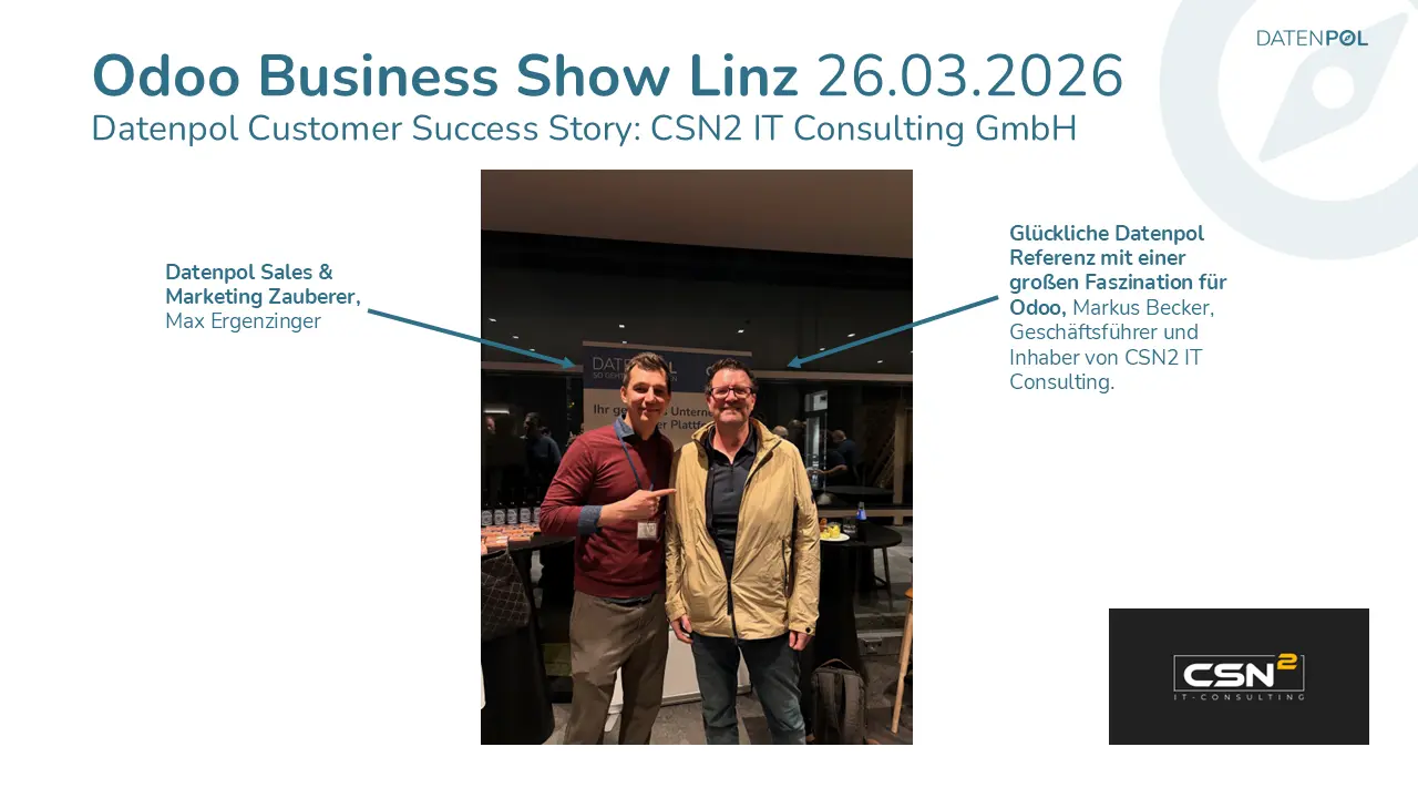 Was hinter diesen Zahlen oft untergeht: Der Erfolg einer Odoo-Einführung hängt maßgeblich von der Beziehung zwischen Partner und Odoo ab. Für uns als Datenpol ist diese Zusammenarbeit ein echtes Fundament. Ob technischer Support, gemeinsame Kundenevents oder strategischer Austausch — wir können uns auf Odoo verlassen, und Odoo kann sich auf uns verlassen. Eine Partnerschaft auf diesem Niveau ist nicht selbstverständlich, und wir wissen das sehr zu schätzen.