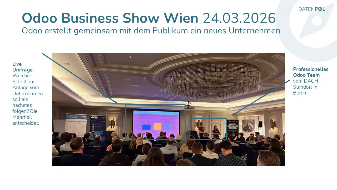 Was die Odoo Business Shows dabei besonders macht, ist die Interaktivität. Das Publikum entscheidet per Smartphone-Abstimmung mit, welche Funktionen als nächstes gezeigt werden. Odoo setzt dafür das eigene Umfrage-Modul ein — die Mehrheit bestimmt den weiteren Verlauf der Präsentation. So sieht jede Business Show etwas anders aus und die Teilnehmer erleben genau die Themen, die sie am meisten interessieren.