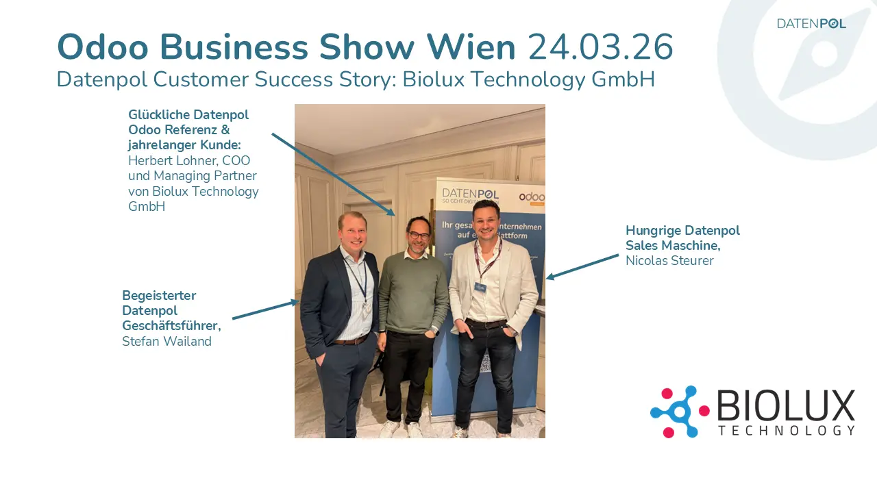 Für die Odoo Business Show in Wien durften wir diese Success Story beisteuern: Gemeinsam mit der Biolux Technology GmbH haben wir auf der Bühne gezeigt, wie eine Odoo-Einführung in der Praxis aussieht, welchen Mehrwert das System im Arbeitsalltag bringt und wie eine jahrelange fruchtbare Zusammenarbeit gelingen kann.