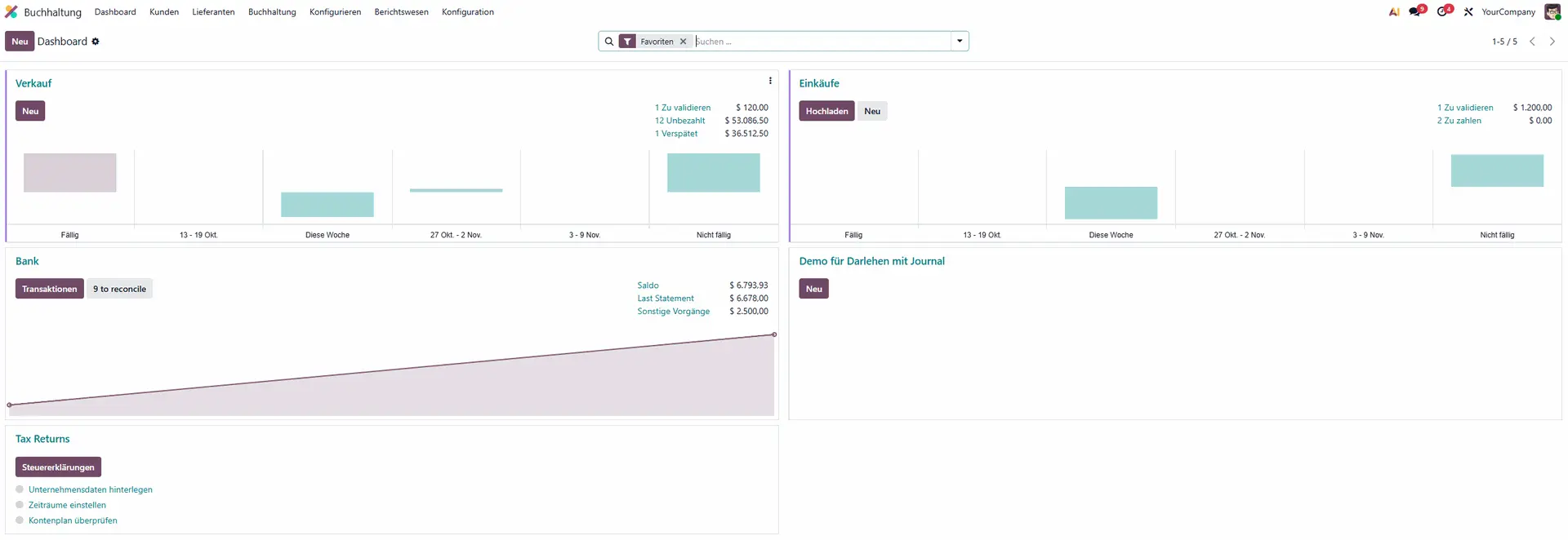 Odoo ist eine modulare Open Source Business-Software für die Buchhaltung, die sämtliche betriebliche Abläufe in einem System bündelt. Die integrierte Odoo Accounting App zählt zu den leistungsfähigsten cloudbasierten Buchhaltungslösungen im europäischen Markt. Sie ist GoBD-zertifiziert (in Deutschland), vollständig integriert in alle Geschäftsprozesse und darauf ausgelegt, Buchhaltungsaufwand signifikant zu reduzieren.